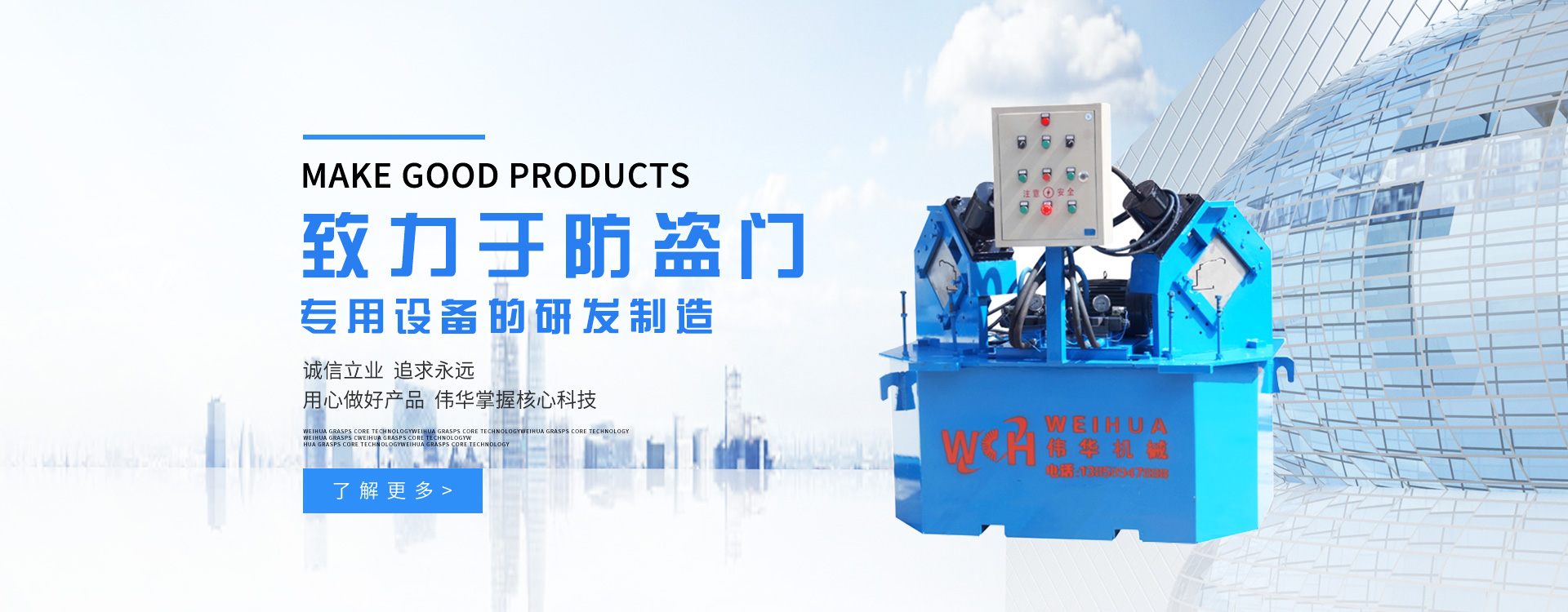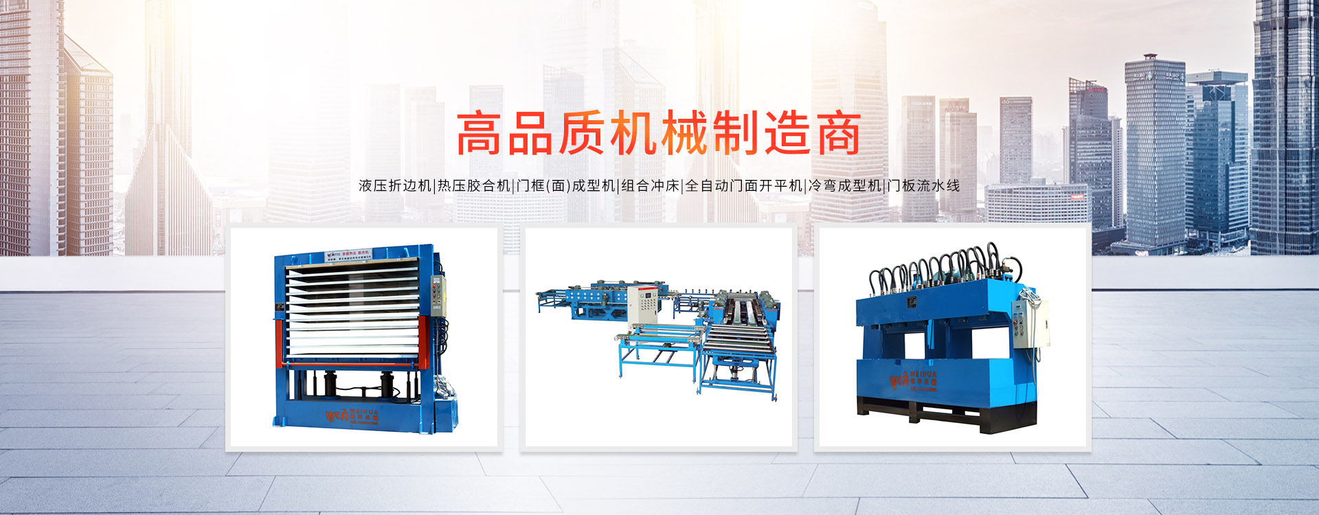 更多>溫州偉華機械制造有限公司地處浙江溫州瑞安市塘下工業(yè)區(qū),創(chuàng)建于2009年,數年來全心致力于防盜門專用設備的研發(fā)制造,主營產品有:門面成型機、門框成型機、熱壓膠合機、組合沖床、液壓折邊機、雙頭沖床、門面開平機。現已具備獨特的管理模式和產品開發(fā)能力,歷經多年的努力,現已發(fā)展成為國內最具影響力的機械設備企業(yè)之一。